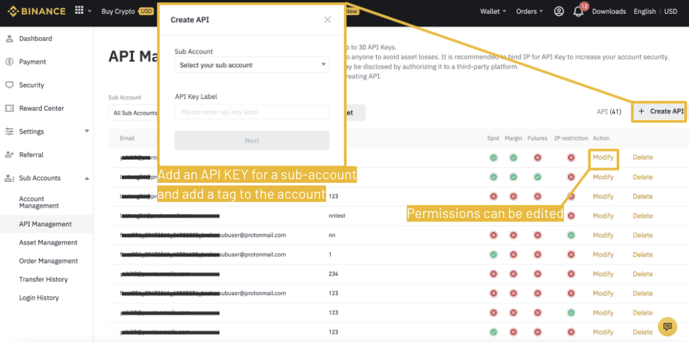 API Management: To create a sub-account API KEY, go to [API Management] and click [Create API]. You can also edit the sub-account API permissions here. Simply click [Modify] to edit.