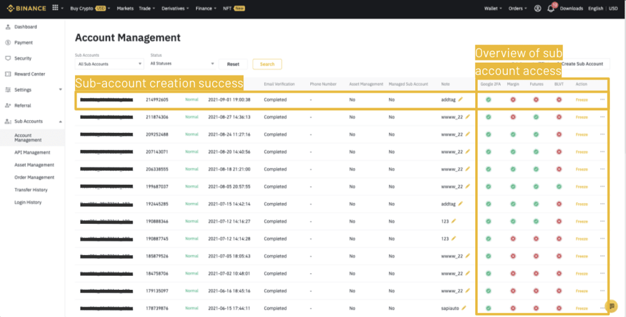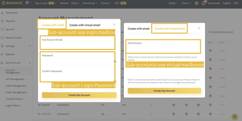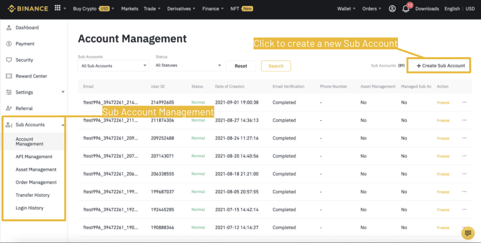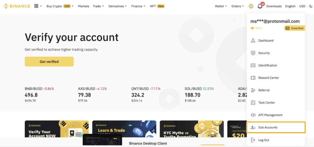Sub-account function is available for corporate account users and VIP1 (or higher) personal account users (KYC identity authentication and Binance/Google authentication are required).