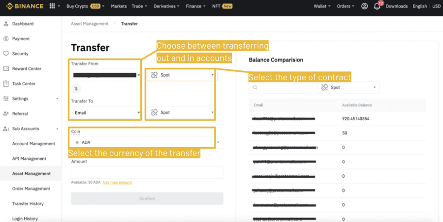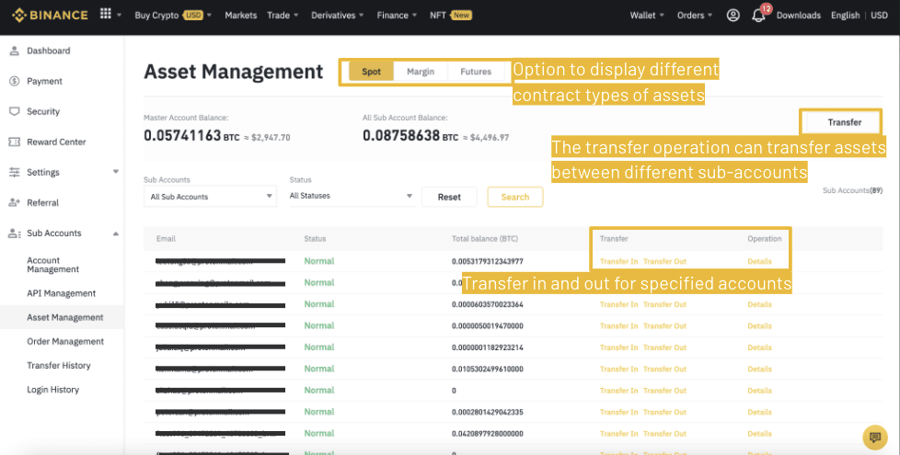 Asset Management: You can check the balance of the master account and all sub-accounts, either in the value of BTC or a fiat currency. Simply click [Transfer] to transfer assets between the master account and sub-accounts instantly without any fees.