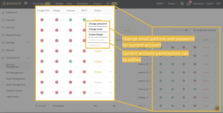 Create a sub-account management center and choose to freeze or unfreeze all functions of each sub-account when needed. For example, you can toggle on Margin account, Future account, and enable BLVT for sub-accounts; you can also change the password of sub-accounts directly from the master account.