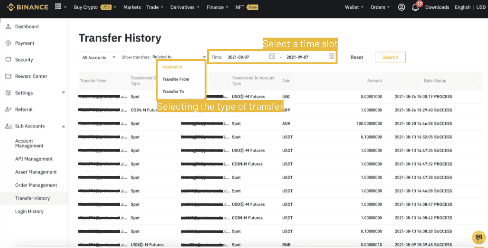 Order Management: You can check [Open Orders], [Order History], and [Trade History] of all your sub-accounts. You can also filter orders by dates and trading pairs.