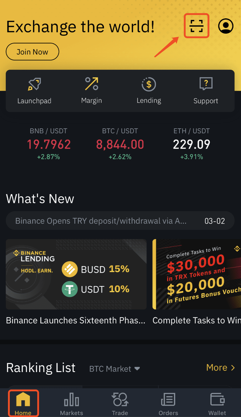 Open your Binance app and navigate to [Home] section and tap on the [Scan] button or tap the Scan symbol on the upper right corner on the home page.