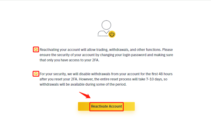 Read the reminder carefully and tick the respective boxes once you accept the terms and given information. Click on the【Reactivate Account】button to proceed further.