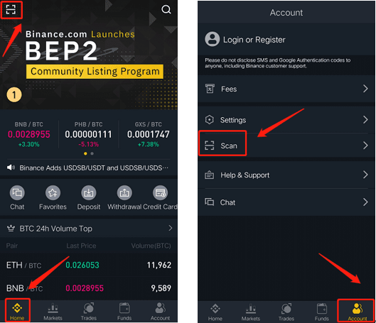 Open your Binance app, navigate to [Account] section and tap on [Scan] button or tap the Scan symbol on the upper left corner on the home page.