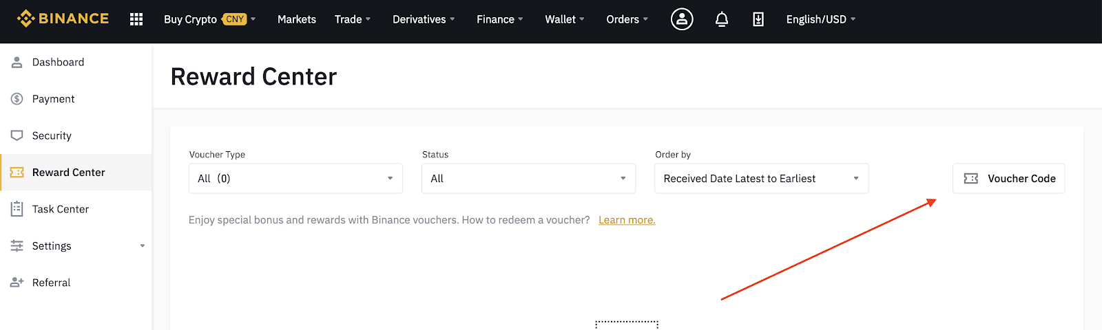 1. Click on your Account icon and select [Reward Center] from the drop-down menu or in your dashboard after logging in to your account. Alternatively, you can directly visit https://www.binance.com/en/my/coupon or access the Reward Center via the “Account” or “More” menu on your Binance App.