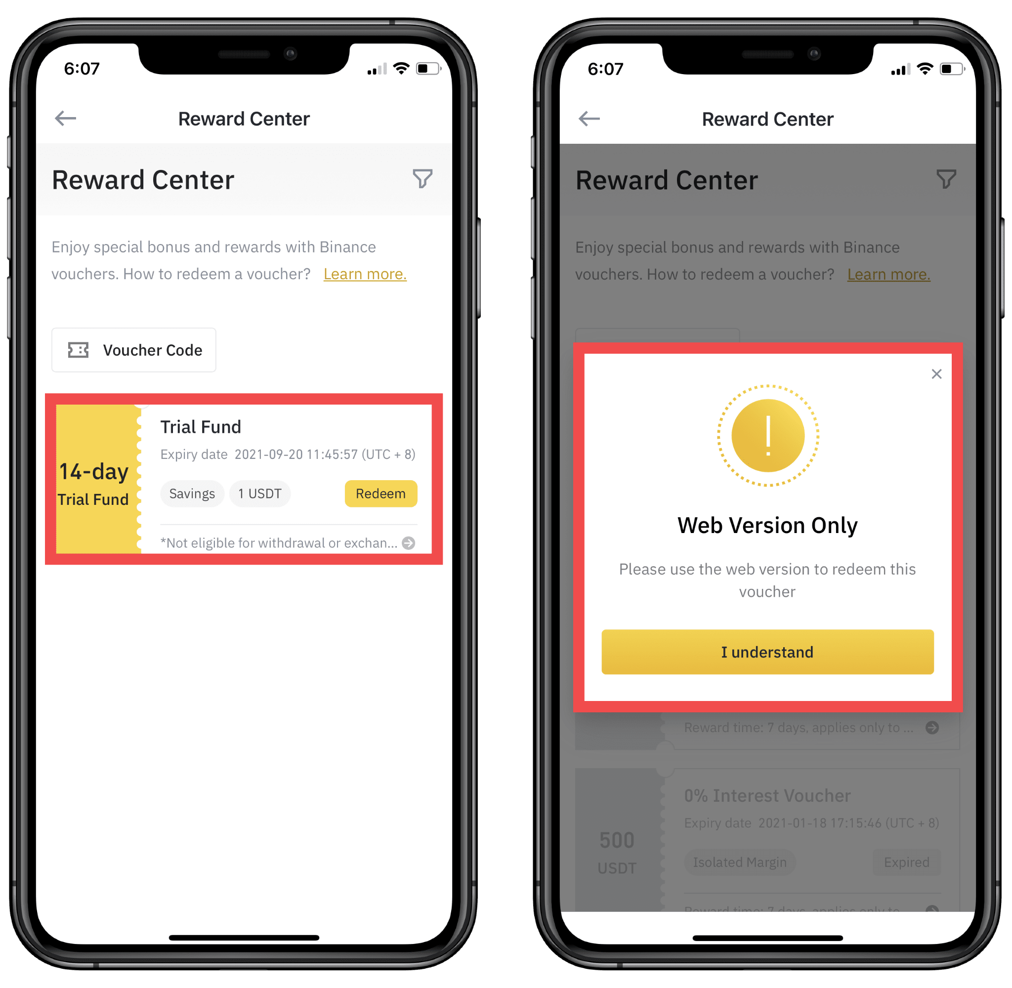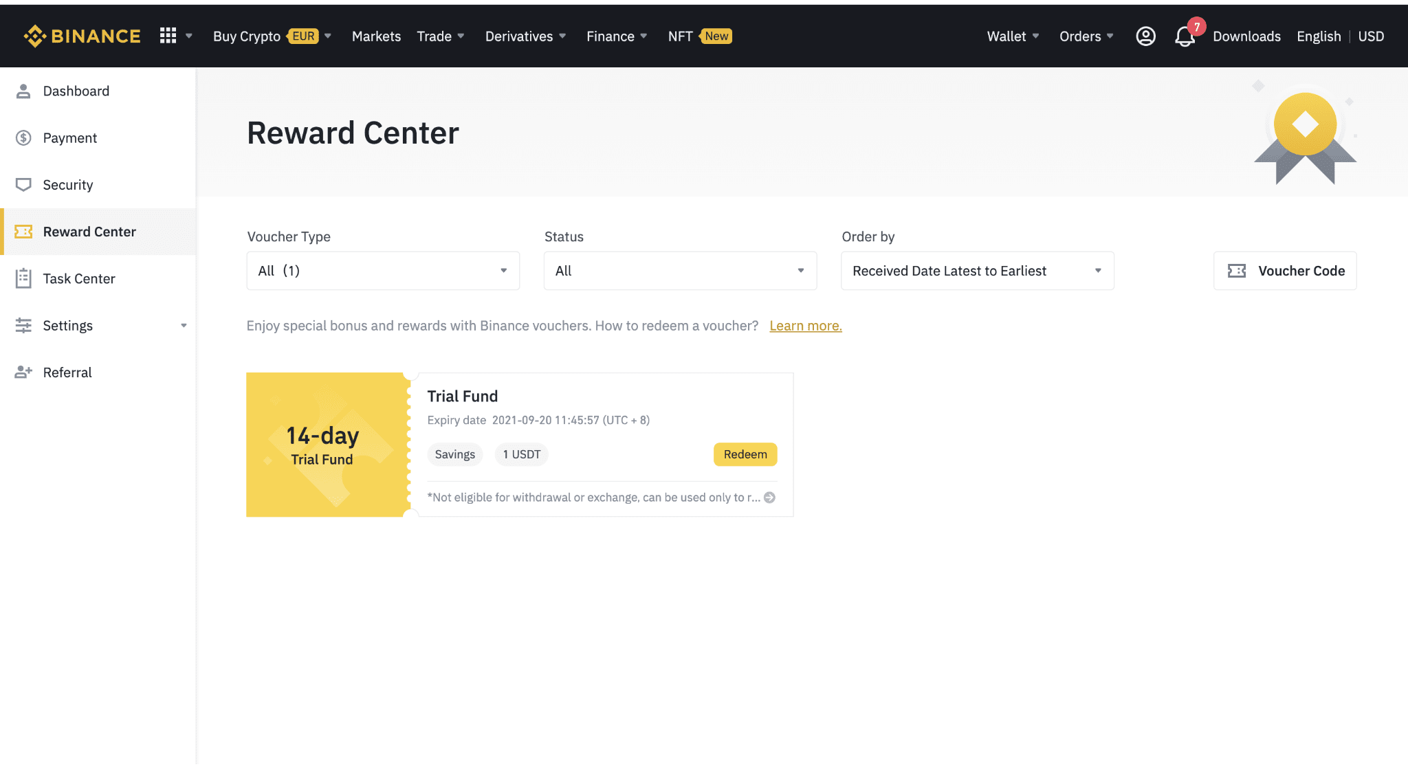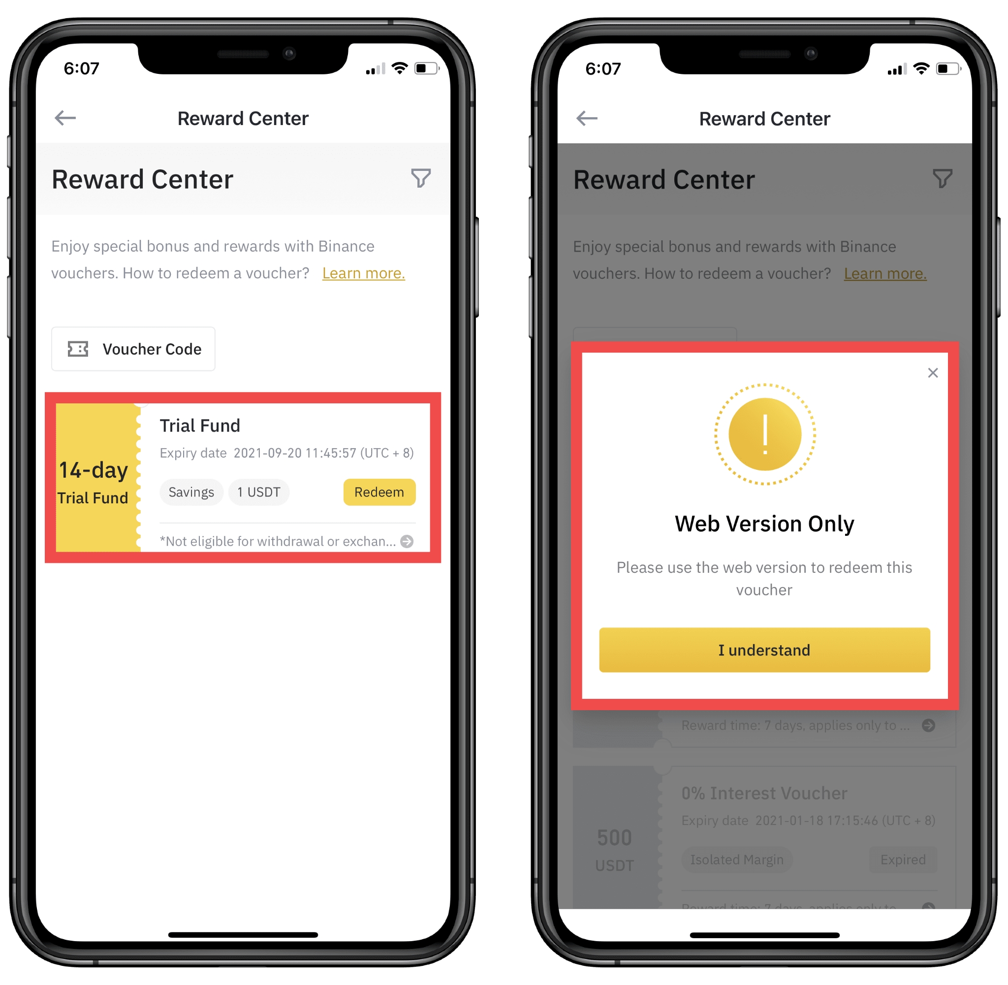 2. Once you receive your Savings Trial Fund, you’ll be able to see its face value, expiry date, and activation period in the Reward Center.Please note that you can only redeem your Savings Trial Fund on the Binance website, and can only apply the vouchers to Flexible Savings products.