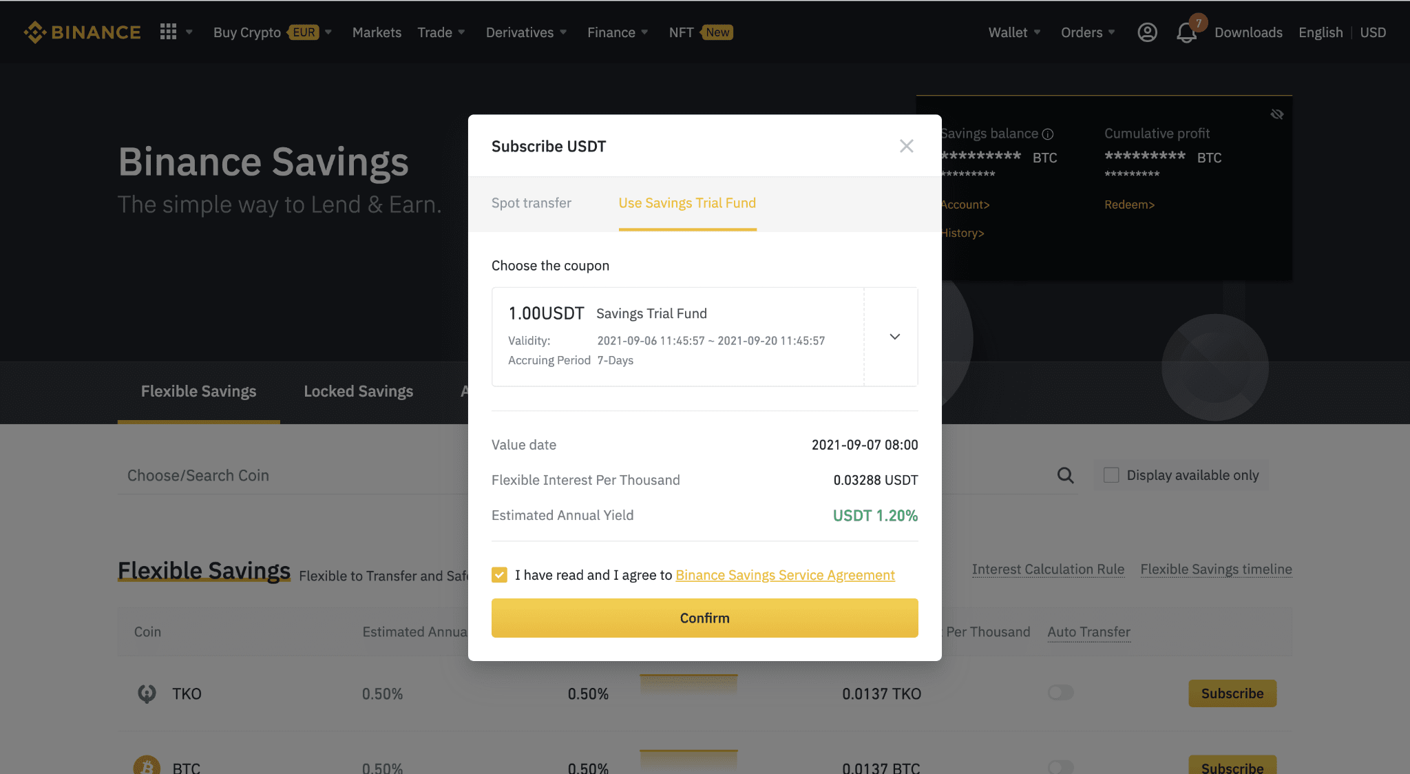 4. You will be redirected to Savings and see a pop-up window. Click the [Use Savings Trial Fund] and choose the coupon you want to use. Read and agree to the Service Agreement and click [Confirm].Please note that Trial Fund is not eligible for withdrawal or exchange, and it can be used only to redeem the annual yield from the Savings product you subscribed.