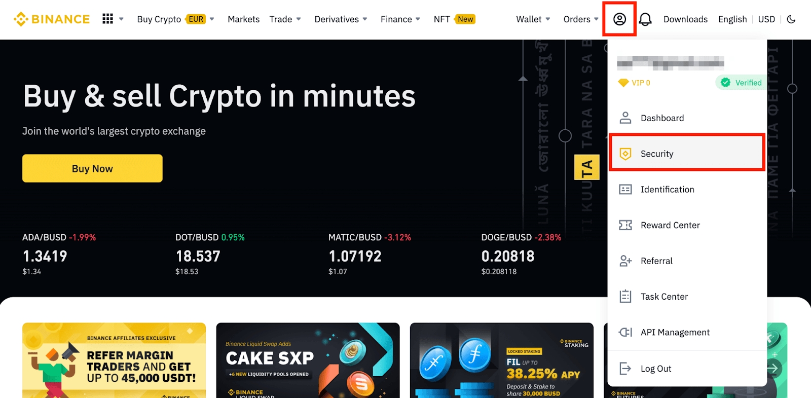 1. Log in to your Binance account and click[Profile] - [Security].