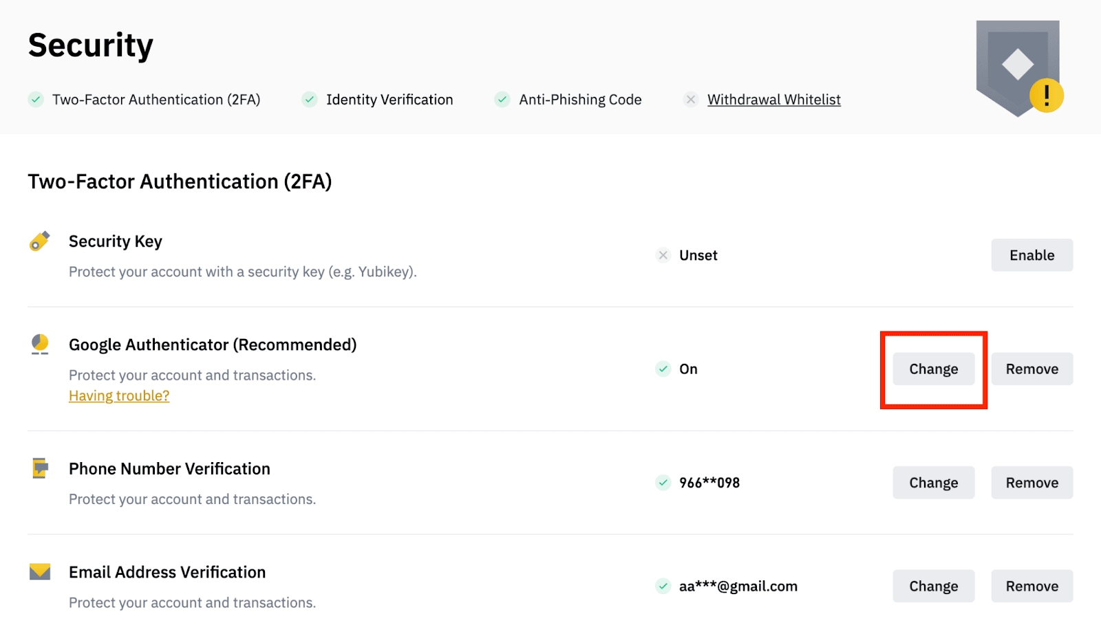 2. Next to [Google Authentication], click [Change] to directly replace your existing Google Authenticator, or click [Remove] to unbind the current Authenticator and bind a new one later.