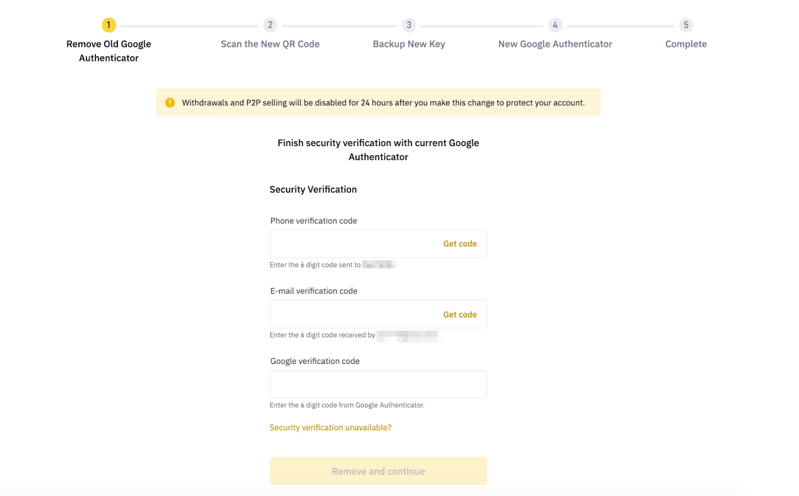To remove your old Google Authenticator, you need to verify this request with your 2FA devices. Then click [Remove and continue].
