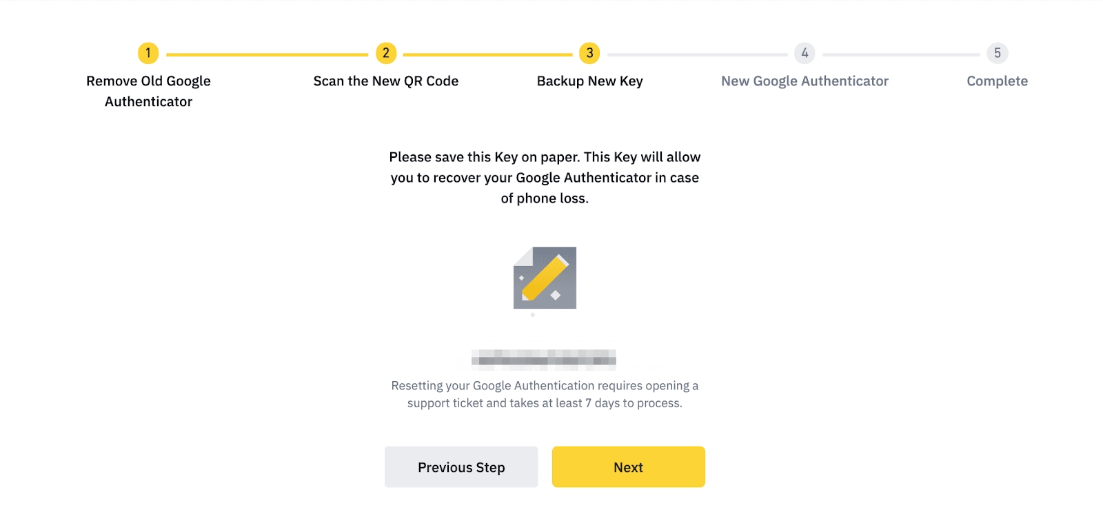You will see a backup key. Please save it on paper. This Key will allow you to recover your Google Authenticator in case you can’t access the app in the future.Click [Next] if you confirm to reset.